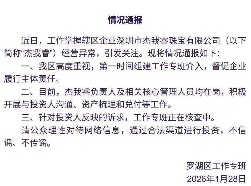 深圳罗湖区工作专班1月31日发布情况通报:罗湖区工作专班持续介入处置深圳市杰我睿珠宝有限公司(以下简称“杰我睿公司”)经营异常事件,现将最新情况通报如下: