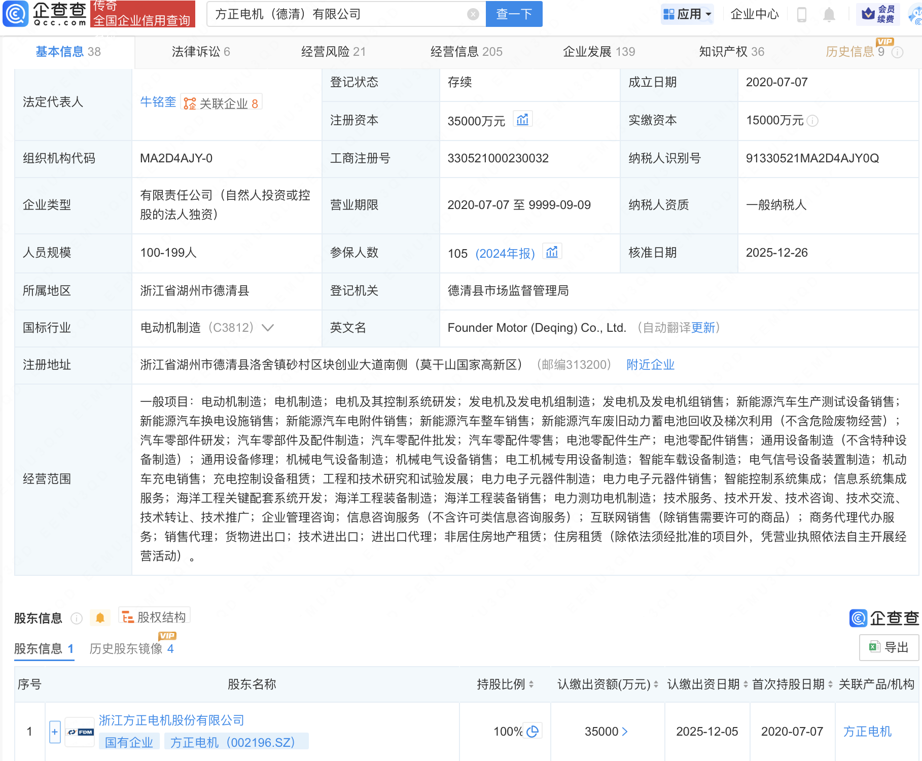 近日,方正电机(德清)有限公司发生工商变更,注册资本由2.5亿元增至3.5亿元。此前5月,该公司注册资本由1.5亿元增至2.5亿元。企查查信息显示,该公司成立于2020年,法定代表人为牛铭奎,经营范围包含:电动机制造;电机制造;电机及其控制系统研发;发电机及发电机组制造等,由方正电机(002196)全资持股。